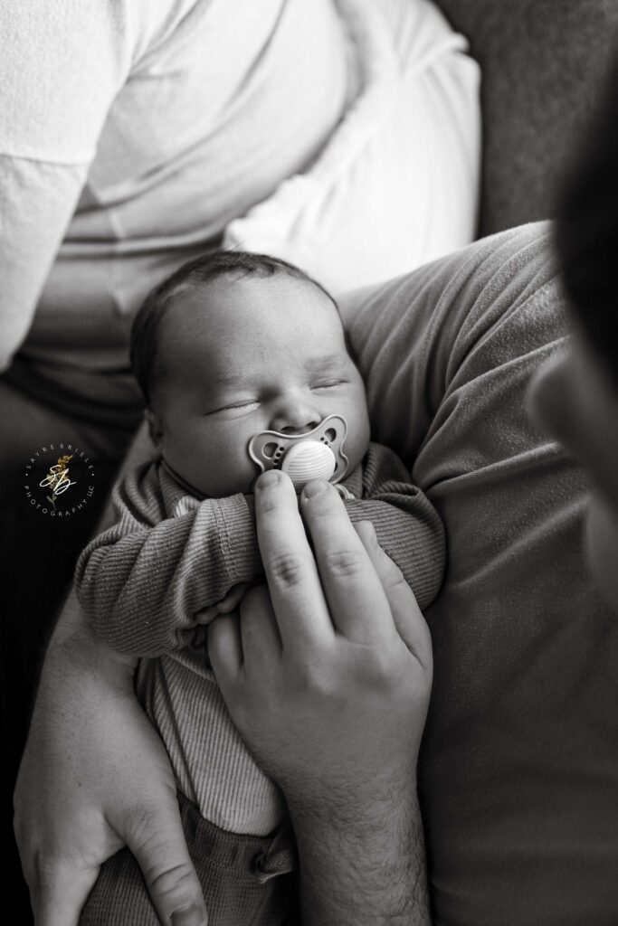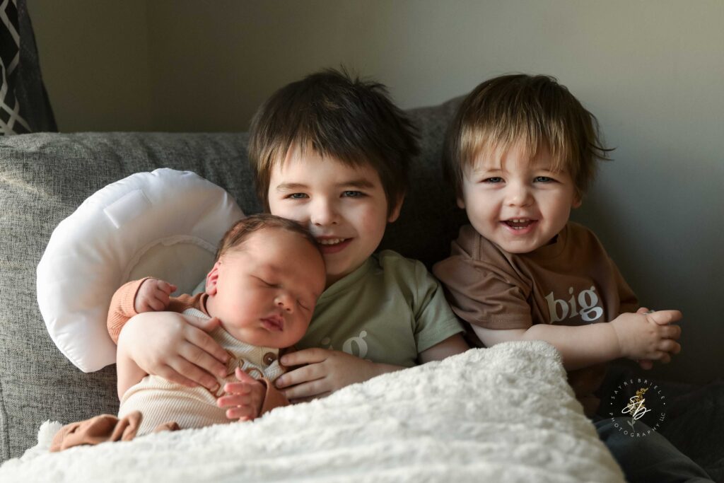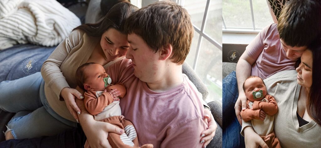 Once everything was set up, we began the session with some family portraits. Contrary to my usual style of traditional posed newborn family portraits, we opted for a more relaxed, organic approach. We captured sibling giggles, baby snuggles, and the tender embrace of mom, dad, and their brand new bundle of love.